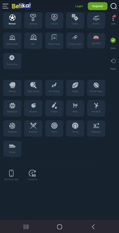 The Betika website has a simple and intuitive interface. Use the menu on the website’s upper left corner to see all the available options. For example, users may choose between light and dark themes. This option has an icon in the shape of the sun and is really convenient when you are tired of bright colors.