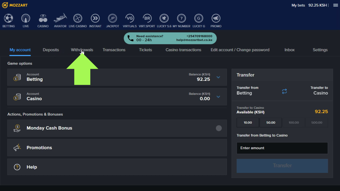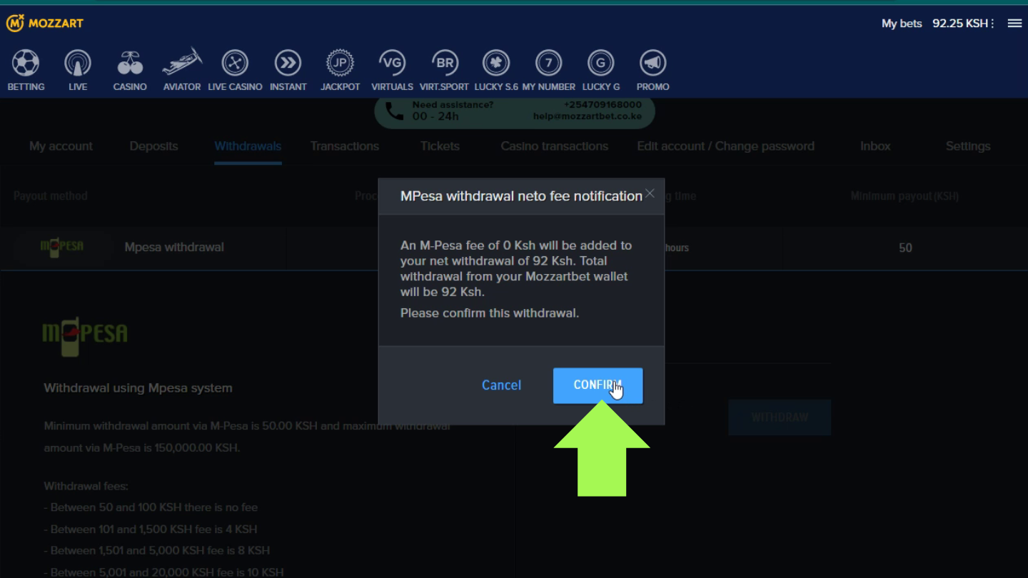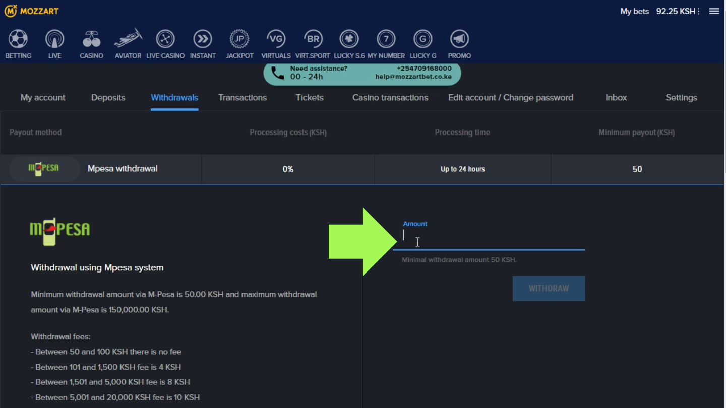 If you want to withdraw funds from the sportsbook, you can do it through the website or app. The process is straightforward and intuitive. Just find the “Withdrawal” section and select the M-Pesa withdrawal method.