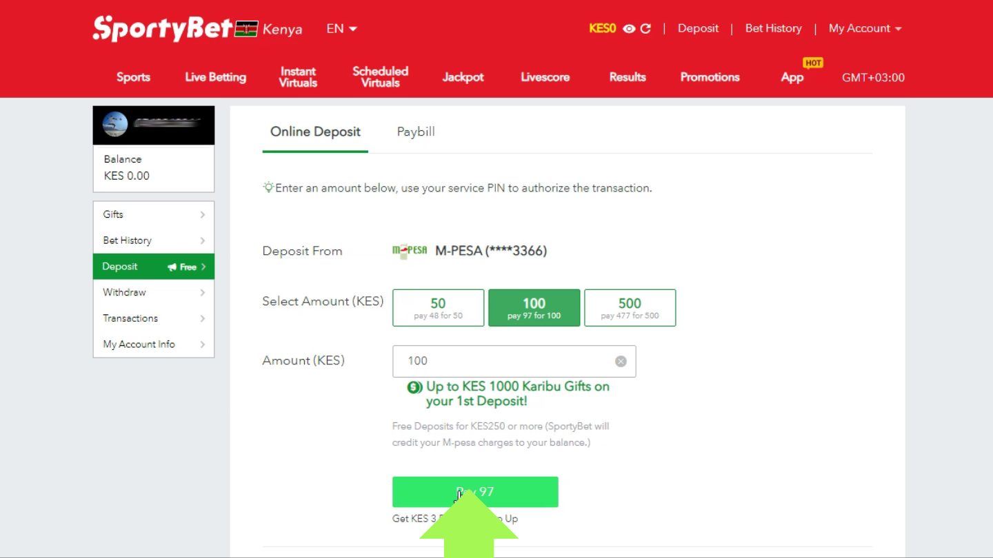 Enter the sum you want to deposit in your betting account. The minimum is just 50 KES.
