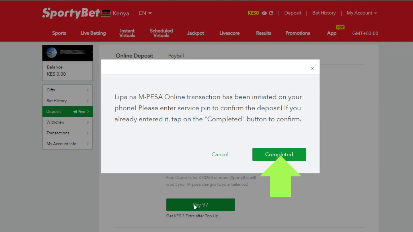 It’s important to note that depositing from M-Pesa moves the funds to the SportyBet account registered on the same phone number your M-Pesa account uses. Make sure that they match each other.