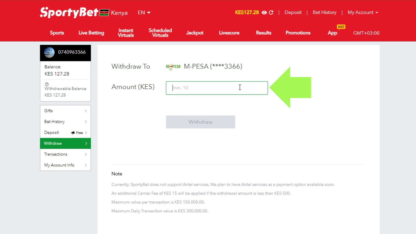 The amount will be sent to the M-Pesa account connected to the same number that you used to register on SportyBet. Make sure that they match.