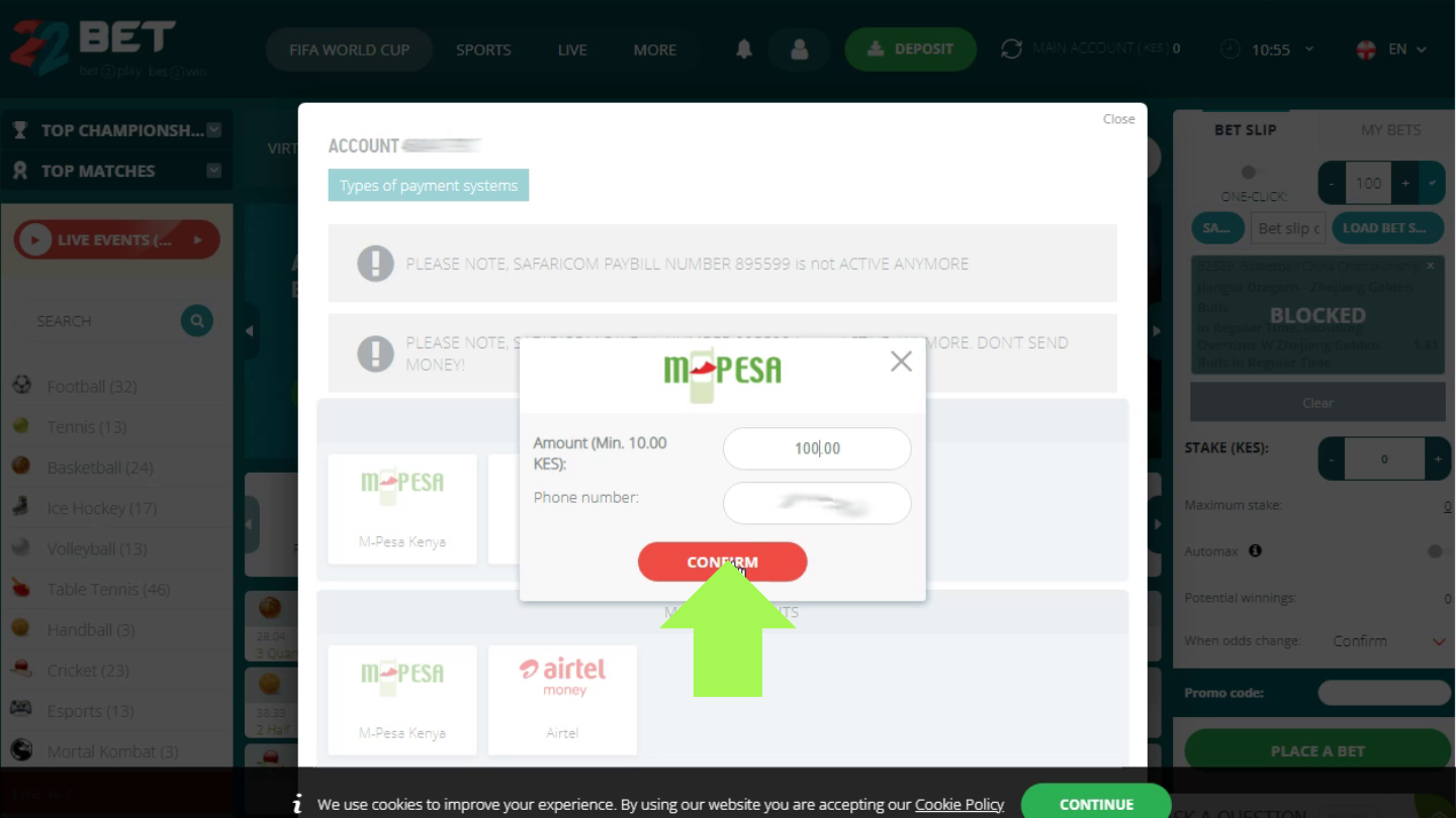M-Pesa is one of the most popular ways to transfer your funds in Kenya, being one of the most common payment systems in the country. So, it shouldn’t surprise you that 22Bet supports it as a deposit method. Below are the steps to go through if you want to transfer money on the platform via M-Pesa.