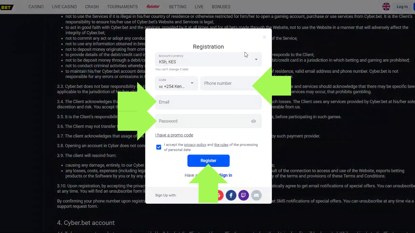 CyberBet is a modern bookmaker that focuses on different types of players. Some of you may prefer the traditional registration with your email, but many players have a Google account and use it to register on different sites. CyberBet allows you to sign up via Google, Facebook, Twitch, or Discord. Each of these social media platforms works perfectly with CyberBet.